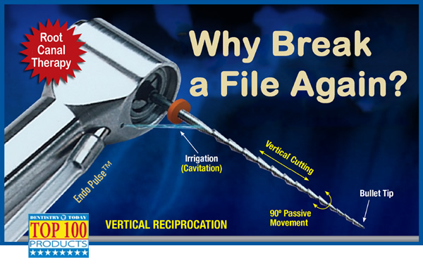 Endo Technic handpieces (Endo Pulse: EP) can make easy work of this part of RCT. Endo Pulse is unique because it replicates natural Hand File motion (Vertical Reciprocation) and uses Stainless Steel Master Files (.02 taper) to quickly cut through calcifications and follow curves directly to the apex (No Fear of file separation).